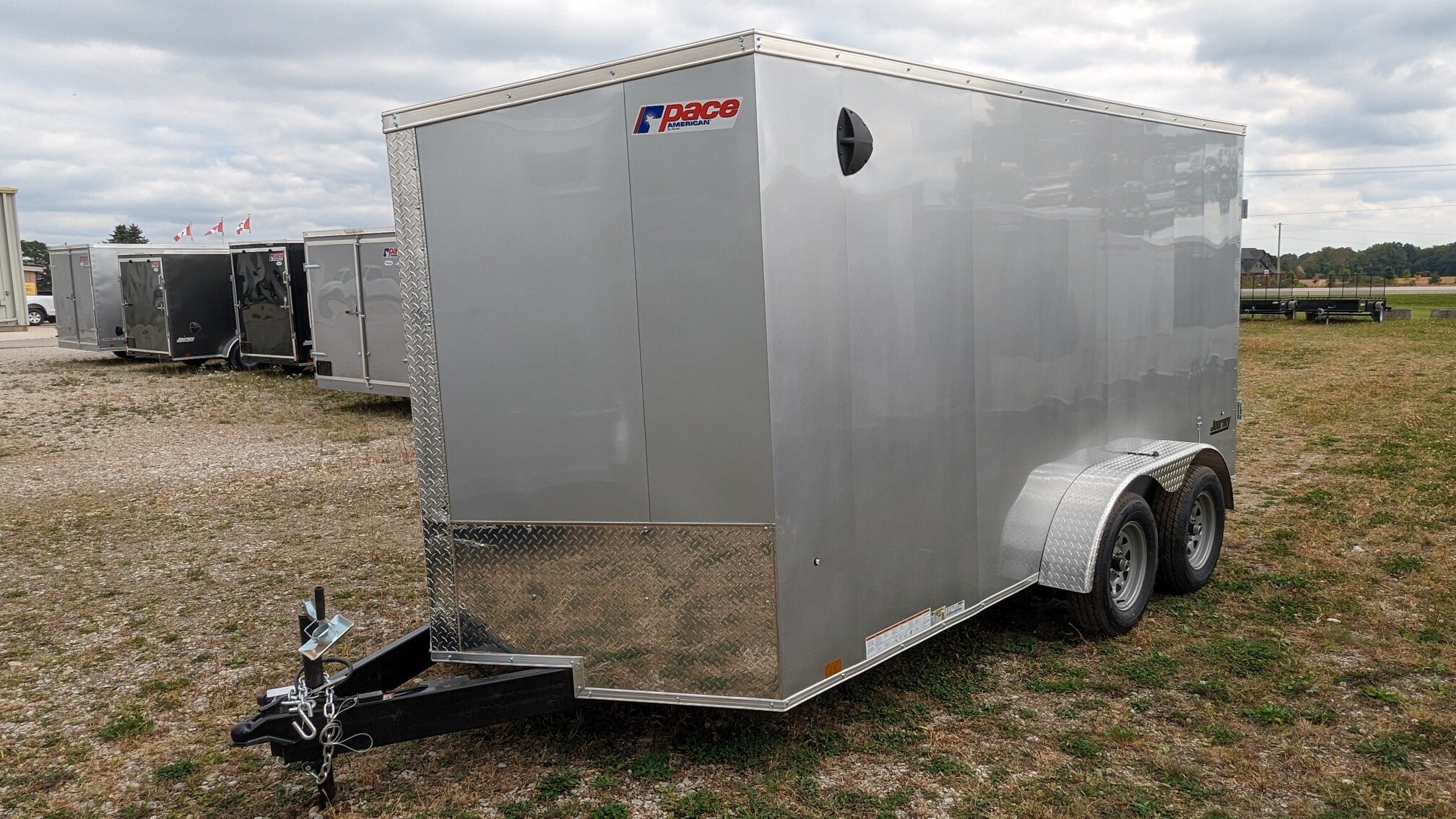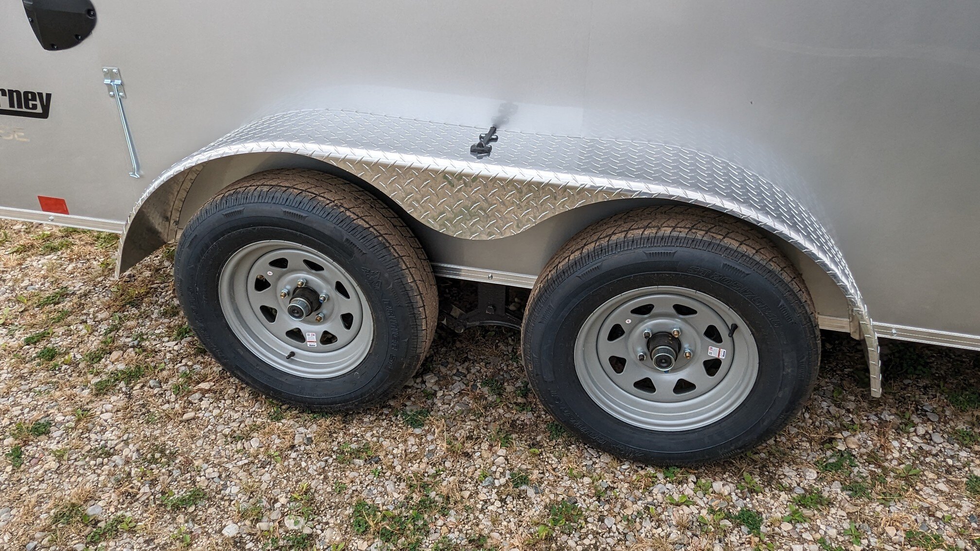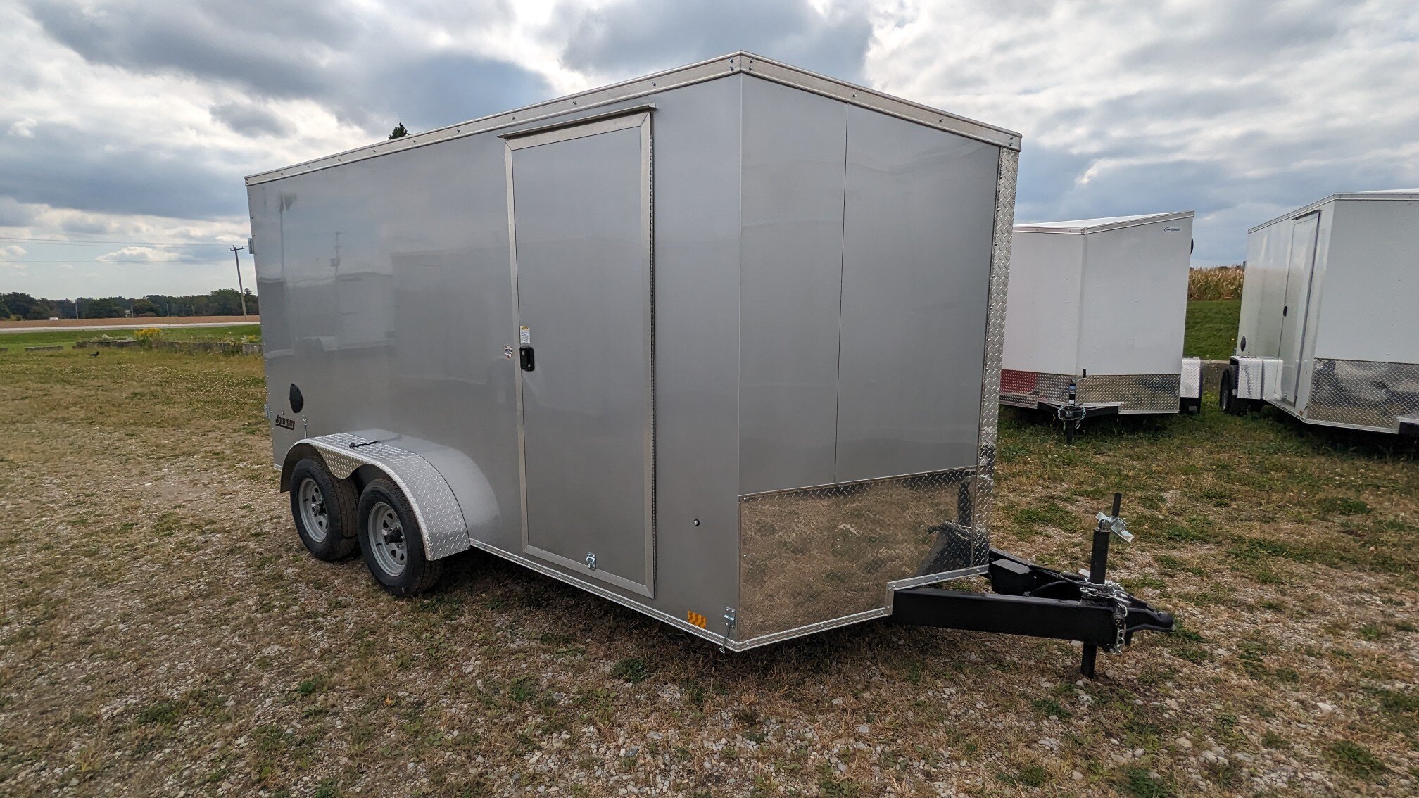 Build Details: - 4\" Tube Main Frame - 6\" A-Frame Tube Tongue - 16\" On-Center Full Height Crossmembers - 16\" On-Center Tube Sidewalls - 24\" On-Center Roof Bows - 24\" Deep Sloped V-Nose with 6\" Drop - 2-5/16\" A-Frame Ball Coupler - Safety Chains - 7-Way Electric Plug - 2K Coupler Mounted Jack - 32\" Wide Entry Door with Flush Lock - Metal Wire Door Holdback - Rear Ramp Door with Spring Assist - ATP Fenders - Drop Spring Brake Axle(s) - Superlube Hubs - ST205/75R15 \'C\' Radial Tires - 15\" Silver Steel Wheels - Automotive Undercoating - 0.030\" Aluminum Exterior - Screwless Exterior - Seamless Aluminum Roof - ATP Nose Cap - 2.5\" Top Trim - 1.5\" Bottom Trim - 24\" Tall Straight ATP Stone Guard - Colour Matching Rear Hoop - Sidewall Vents - 78\" Interior Height (72\" Standard \ 6\" = 78\") - High Performance Wood Walls and Trim - Lauan Ceiling Liner Strip - 3/4\" High Performance Wood Flooring - (1) LED Dome Light with Switch - Bullet LED Marker and Clearance Lights - Slimline LED Tail Lights with Integrated Backup Light - Rear Double Doors - Zinc Holdback