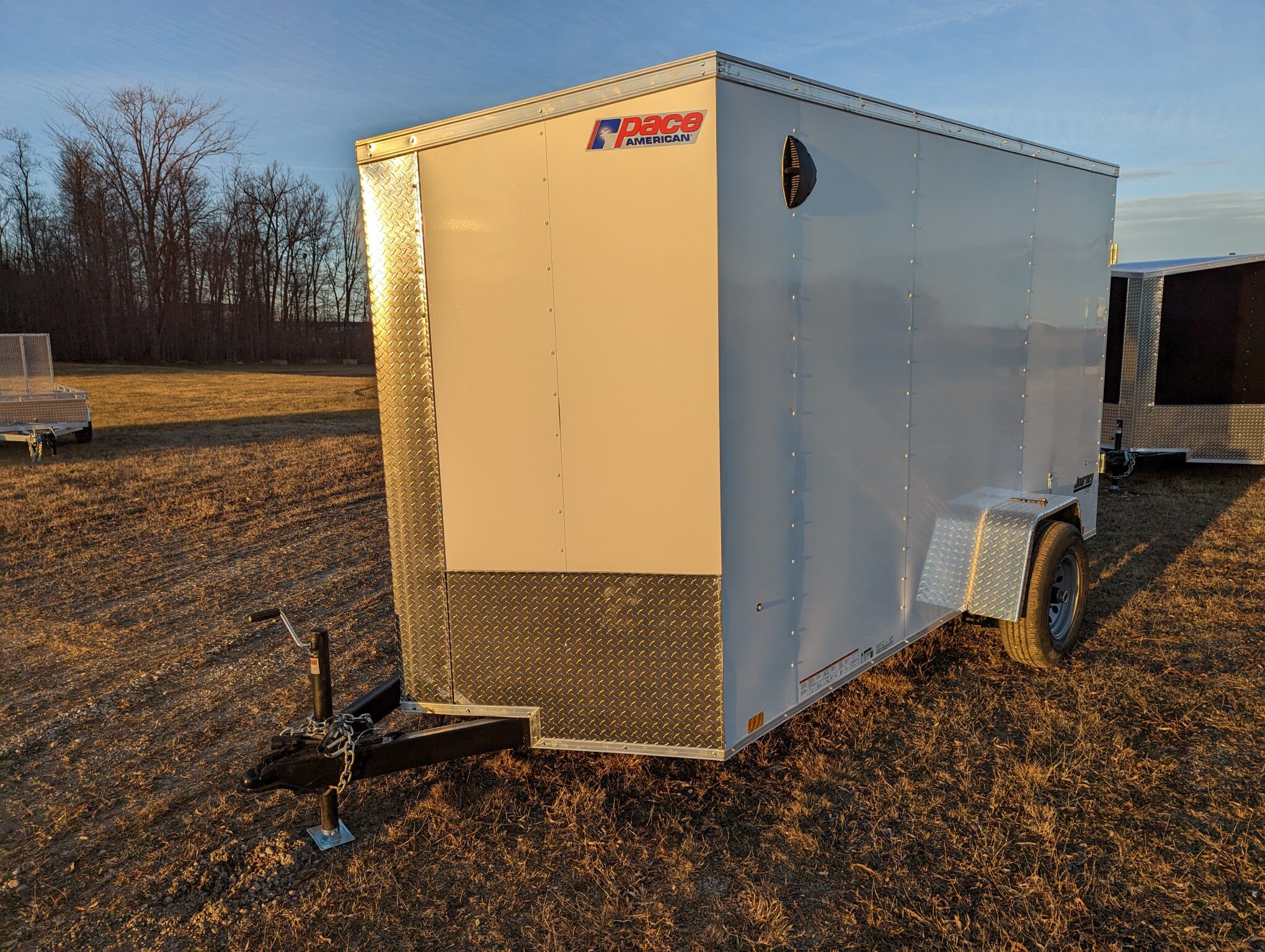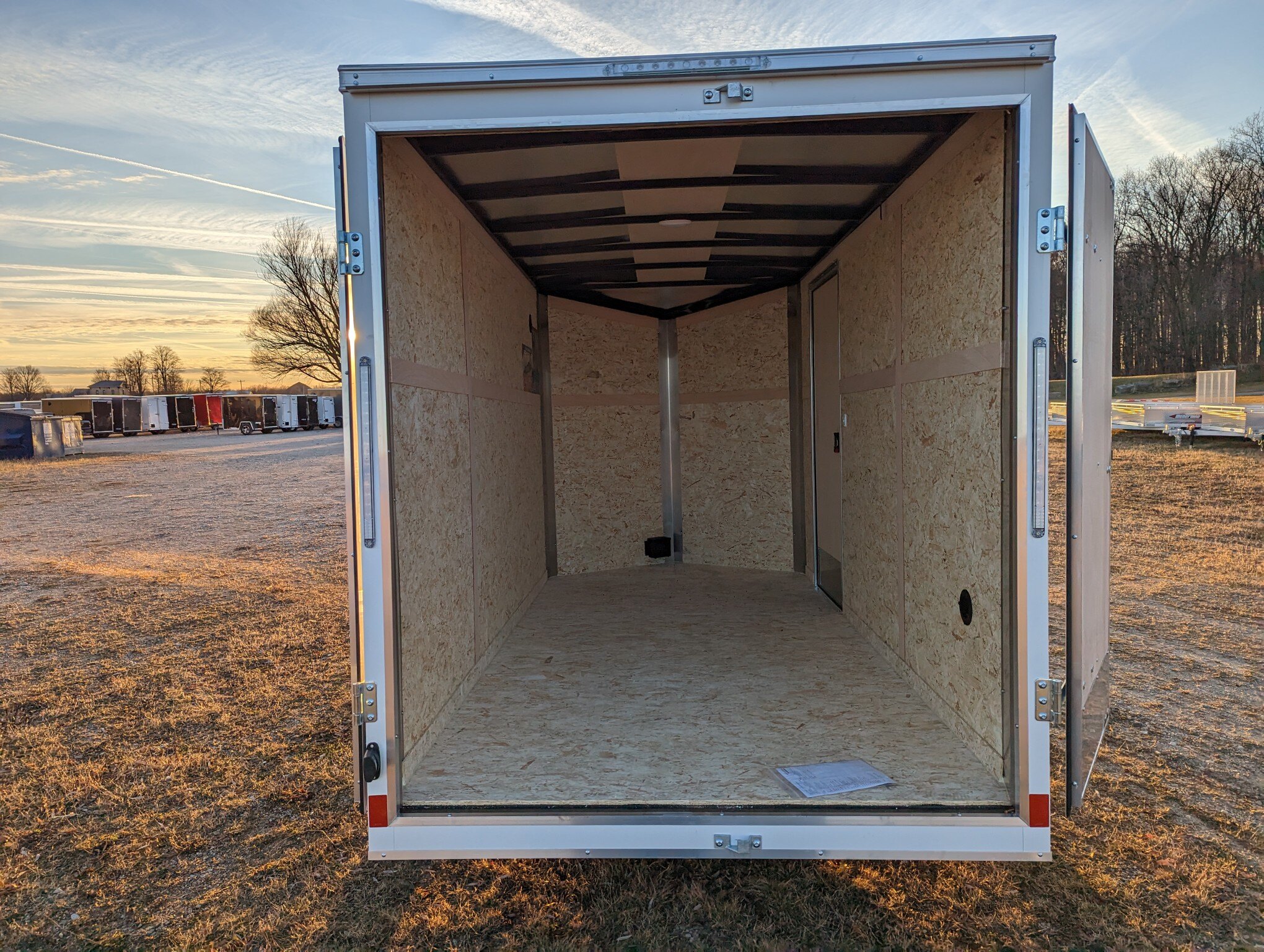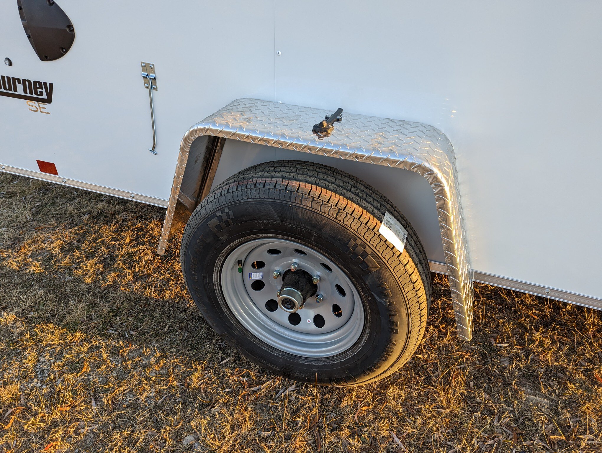 Style: Journey SE / Flat Top / 24 in Sloped V-Nose Axle: Single / Drop / Electric Brakes Axle Type: (1) 5,200 LB Spring w/ Superlube Hubs Tire: (2) ST225/75R15 36 Lug Radial Rim: (2) Silver MOD Main Frame: 2in x 4in Tube / ZXMs 16in on center Main Frame: Undercoated Coupler: 2-5/16 inch ball Hitch: 2 Piece Jack: 2000lb top wind w/ sand pad Vertical Post: 78-3/4in V.P.H (\6\" of Height = 78\" IH) Sidewall: Z-Post/16in centers/24in Sloped V-Nose Roof Bow: 1 x 1-1/4 semi crowned tube 24in centers Floor: 3/4in High Performance Wall: High Performance Ceiling: None Exterior Metal: Screwless w/ Screwed Seams and Colour Matching Screw Where Applicable Exterior Metal: 0.030 White Front Nose: ATP 0.025 Embossed Stoneguard:24 in High 0.025 Embossed Fender: ATP Jeep Style Roof: 1 Piece Aluminum, 16in wide 2.7 lauan ridge board Rear Hoop: Same color as trailer Top Trim: 2-1/2 in Bottom Trim: 1-1/2 in License Plate Bracket: Molded Plastic Rear Door: Double Rear Doors C/L w/ Metal Hold Backs Side Door: 32w x 74h C/S F/L w/ metal hold back and drip rail above door. Start 16in from front Vent: (2) Sidewall flow through vents Dome Light: (1) LED Dome light centered 12 Volt Switch: (1) C/S Door Cable: 7-way Clearance Light: 3/4\" Bullet LED Clear Lens License Plate Light: Yes Tail Light: (2) LED Clear lens slimline