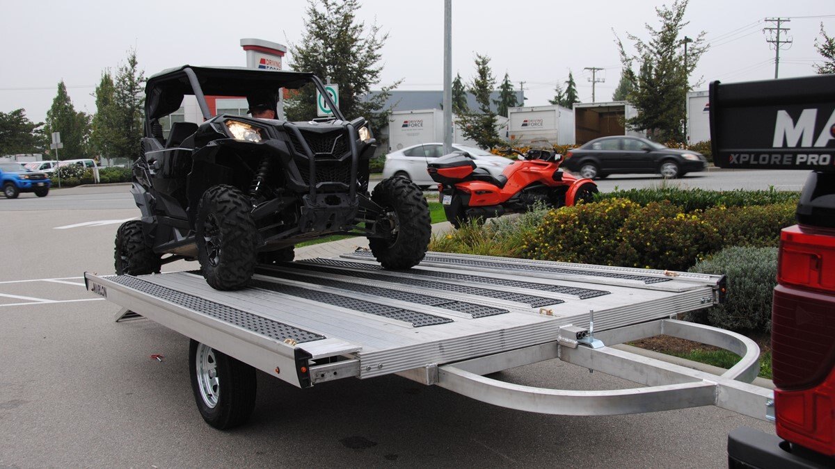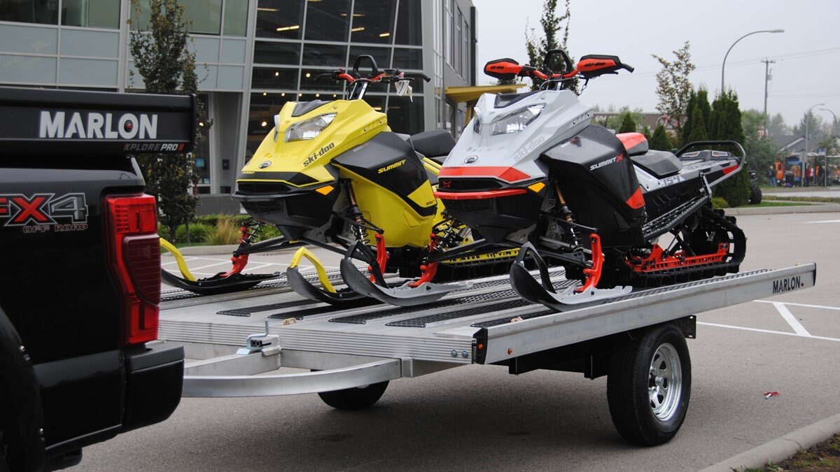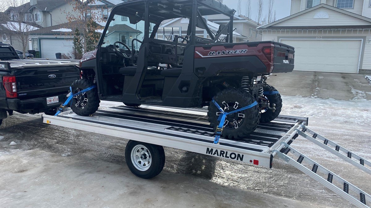 The Marlon New Product development team sat down with the goal of developing a trailer that would do more, could be used for Multiple uses and could be used in Multiple seasons. Development code name was MultiFunctional Trailer. We wanted it lite so it can be towed behind a selection of vehicles to haul your sled, ATV, Trailer SxS, stack of wood …………that’s why it is all aluminum! The sled industry needs a wide trailer for the larger trail machines and a narrow trailer for mountain sleds. We used our experiences and knowledge from 20+ year’s in the sled deck industry and adapted the slide out sides to work on our new Multifunctional two place trailers. Tilt trailer or drive on back off – it’s your call our trailer does both! We also developed a drive on drive off trailer and did but then asked why? Why because the drive on drive off trailer was brought to the industry many years ago when sleds did not have reverse, It adds cost for the additional 2’ of “V nose” decking that is not used and takes up more valuable storage area. We studied users and found that most now reverse off of their trailer because there is no room to the side of their truck in parking lots, we also found they need the rear ramp to drive back on so why not just back off. Why not spend the extra time taking down and putting up the front ramps when you could be going for a beer after a great day exploring! But we wanted more…. And we wanted to be the best and to grow the declining sled trailer business so we kept this in mind and looked for things we could do from the ground up. Extruded sides which you may recognize from our sled decks. With tie down points down the entire side at a 45 degree angle allowing you to tie down dirt bikes, various items you may carry from the lumber yard or to the dump or your ATV or side by side using our tire tie downs. Center extrusion allowing you to tie the center of the trailer items like dirt bikes and ATV’s, lumber and things that need to get to the cottage. Slide out sides as mentioned earlier and aluminum decking. The pure strength of the aluminum extrusion vs. a thin sheet of plywood allows you to tie down items such as ATV’s and not worry about the tires sinking into the plywood and straps coming loose while driving in a thunderstorm – confident that there is no plywood stretching because it has become wet. Our trailer has been designed for all seasons and to meet your needs. It can be used for your current and future toys! |