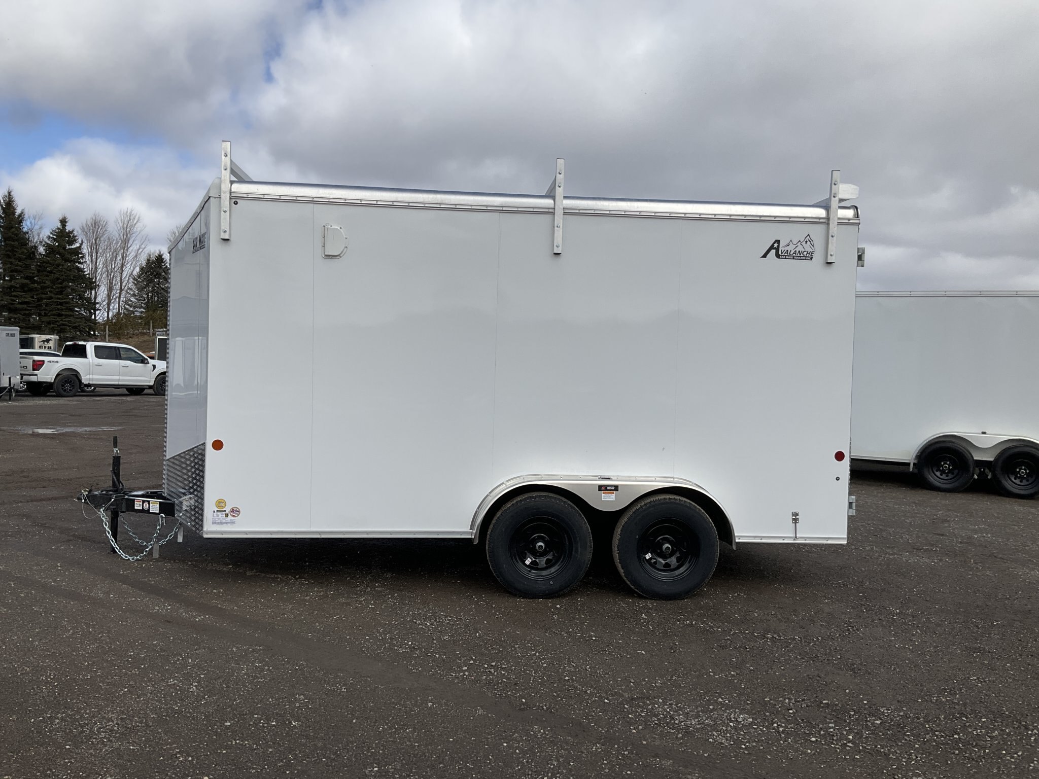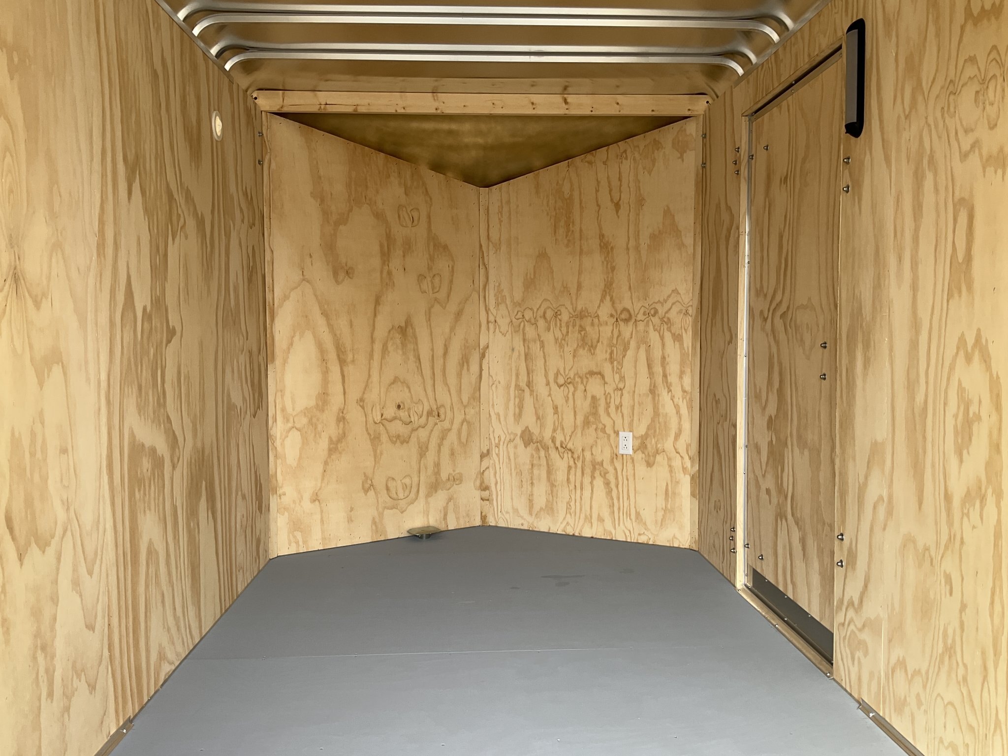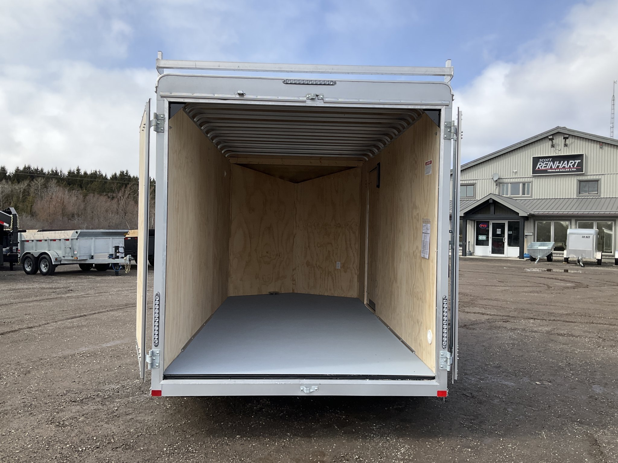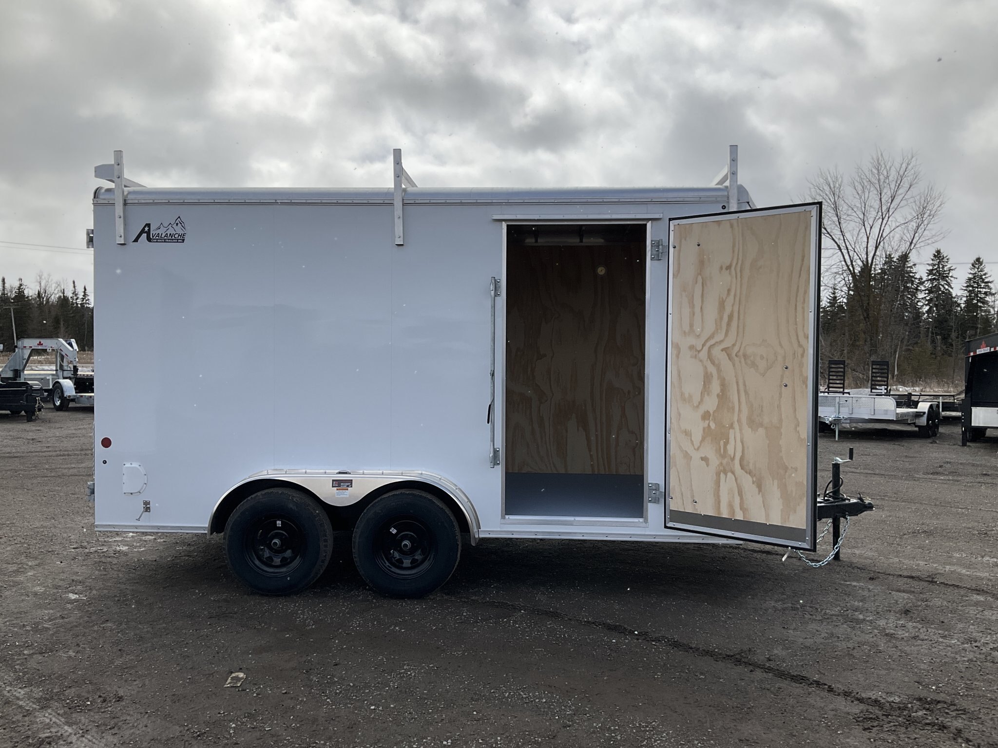 7000LB GVWR, 2 3500LB Torflex Axles, 15" Radial Tires, 21" Sloped V-Nose, 7' Tall, .030 White Screwless Exterior, Side Man Door, Double Rear Doors. 3/8" Plywoof Walls, 3/4" Painted Plywood Floor, Seamless Aluminum Roof, 2 Wall Vents, 12V LED Dome Light, 110V Inlet and Duplex Receptacle, 3 Aluminum Ladder Racks, ATP Stone Guard, A-Frame Tongue Jack with Sand Pad, LED Exterior Lighting