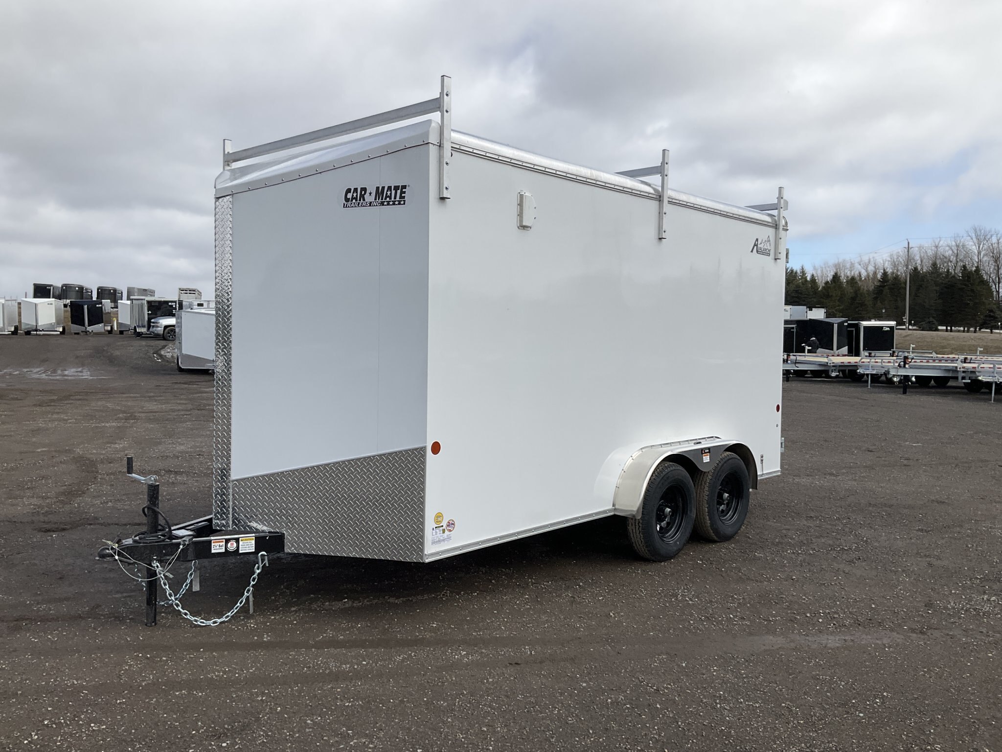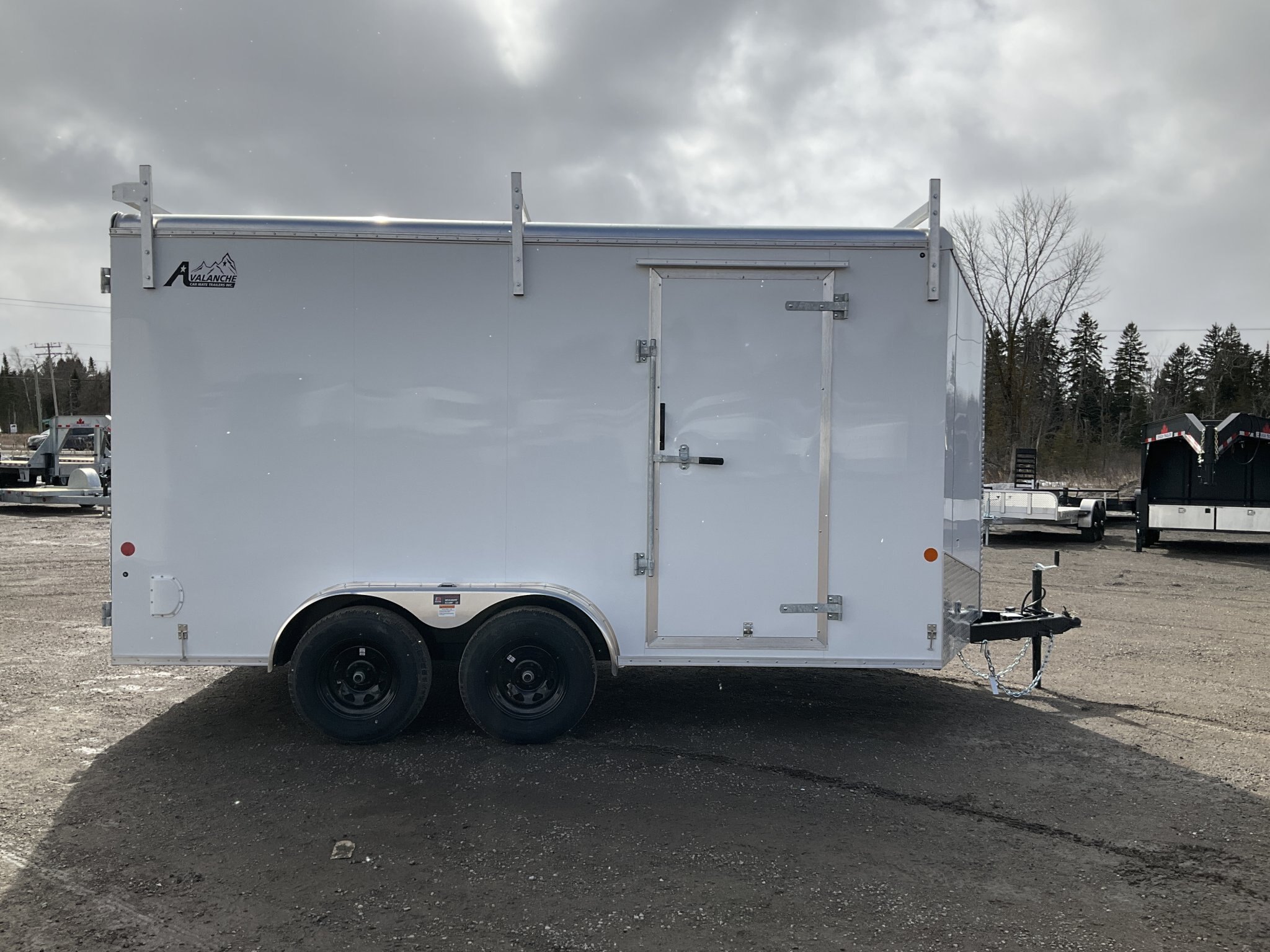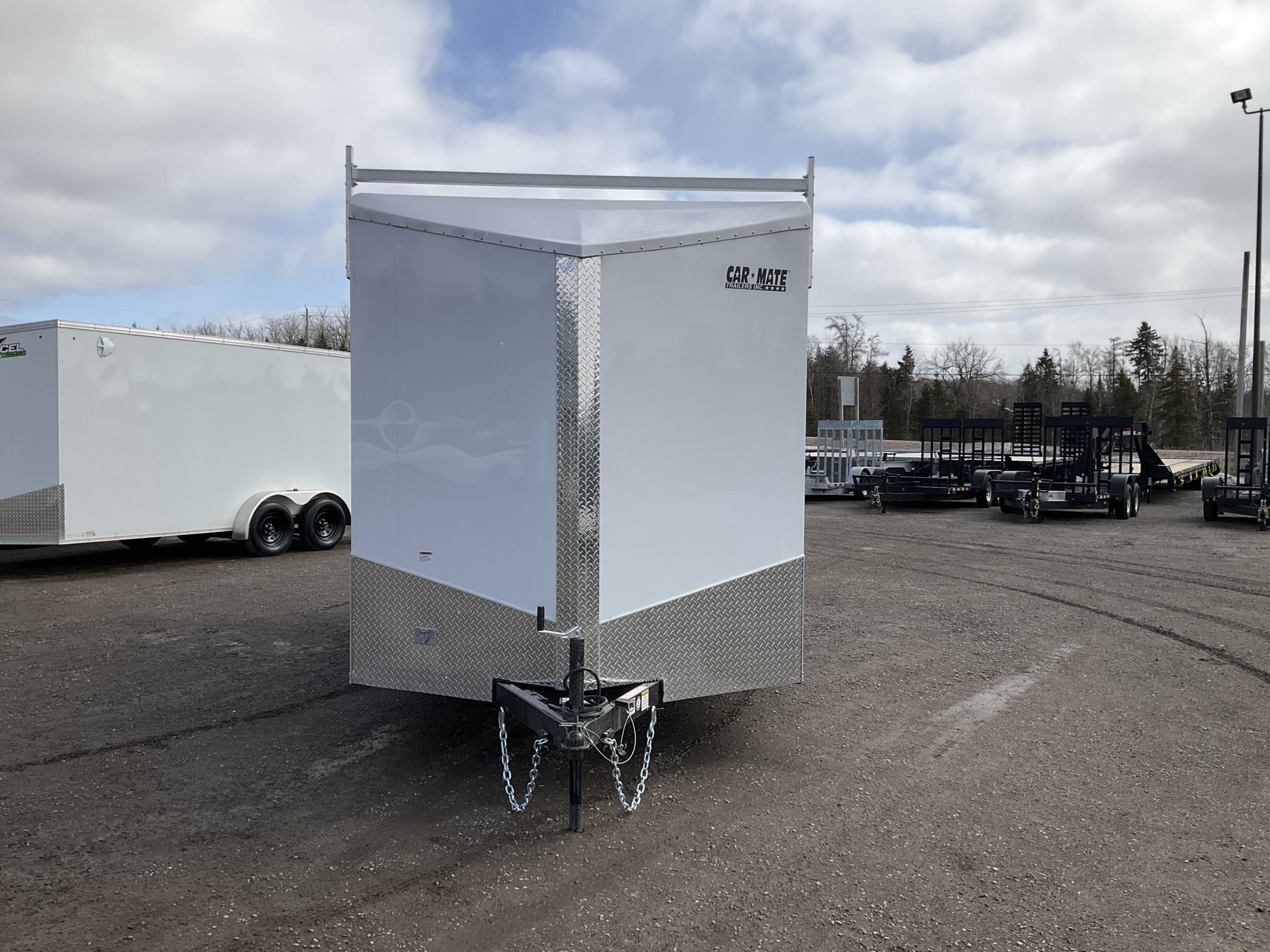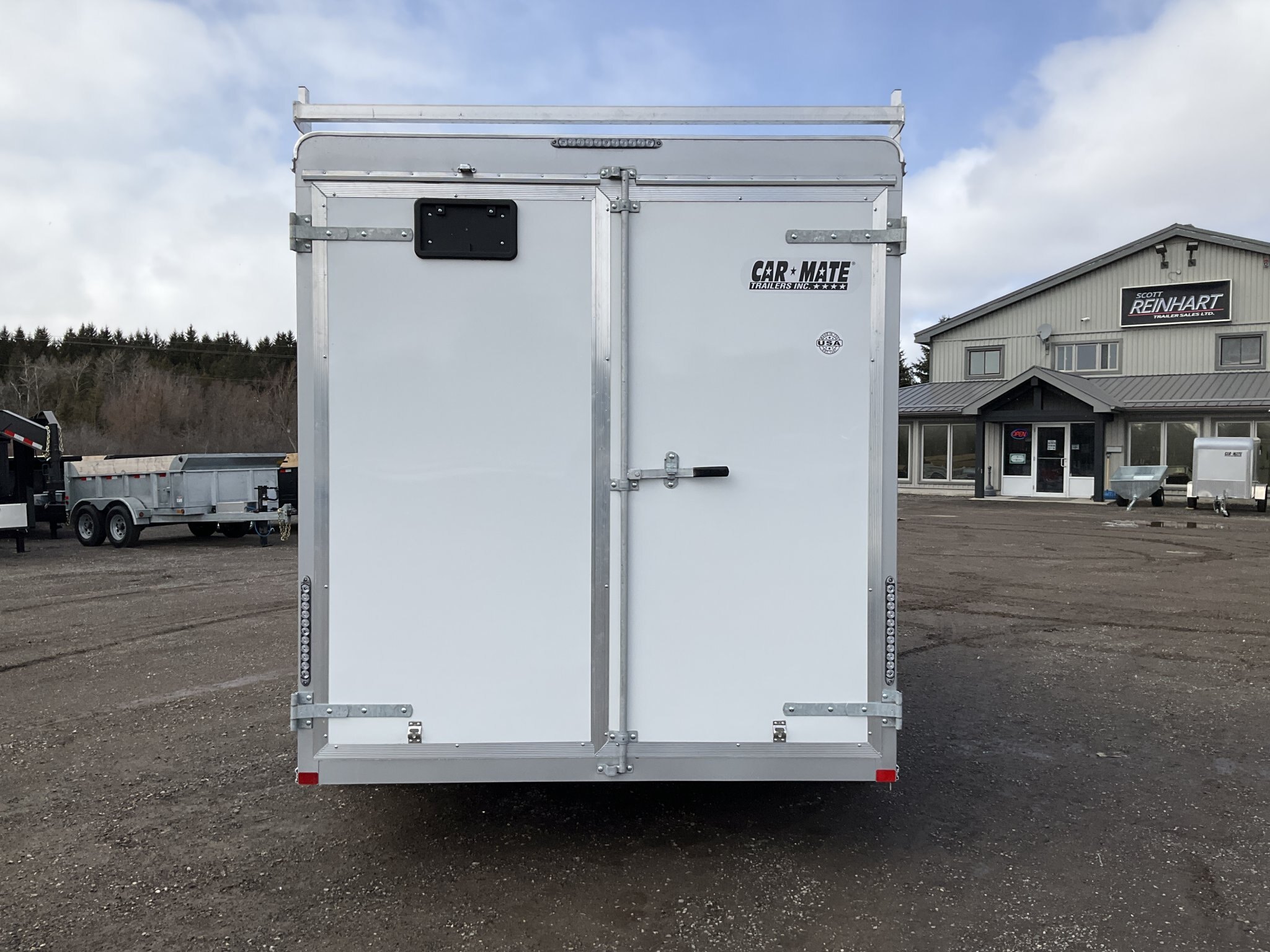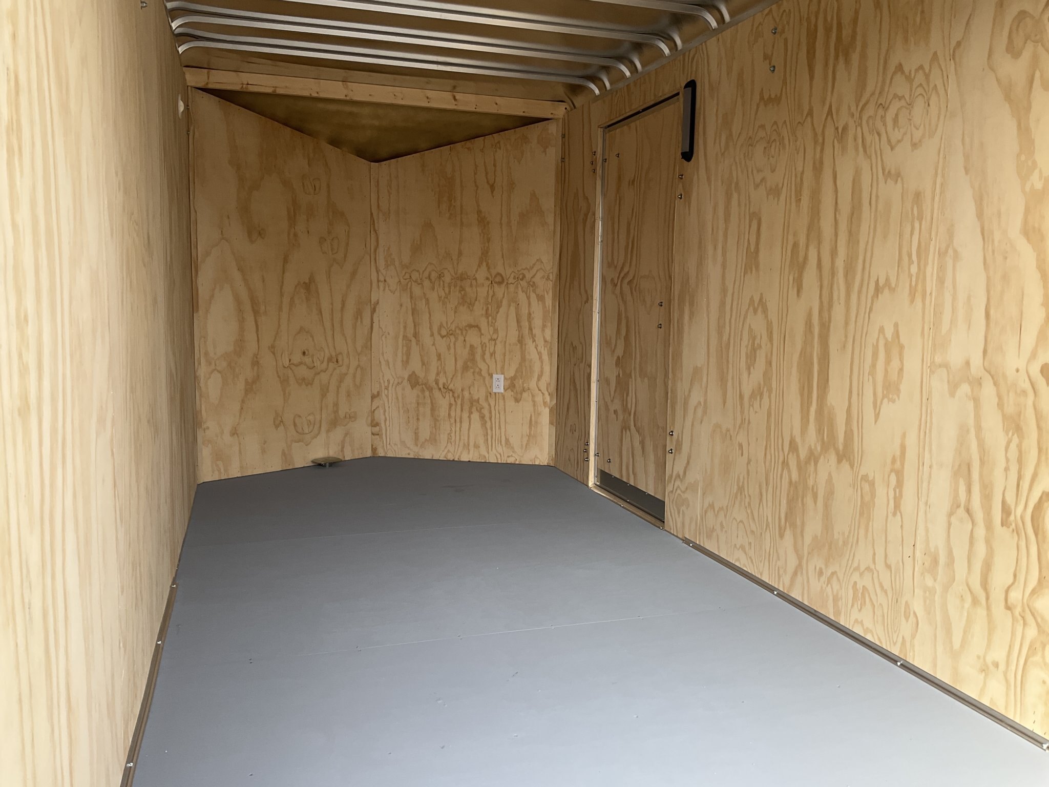 7000LB GVWR, 2 3500LB Torflex Axles, 15" Radial Tires, 21" Sloped V-Nose, 7' Tall, .030 White Screwless Exterior, Side Man Door, Double Rear Doors. 3/8" Plywoof Walls, 3/4" Painted Plywood Floor, Seamless Aluminum Roof, 2 Wall Vents, 12V LED Dome Light, 110V Inlet and Duplex Receptacle, 3 Aluminum Ladder Racks, ATP Stone Guard, A-Frame Tongue Jack with Sand Pad, LED Exterior Lighting